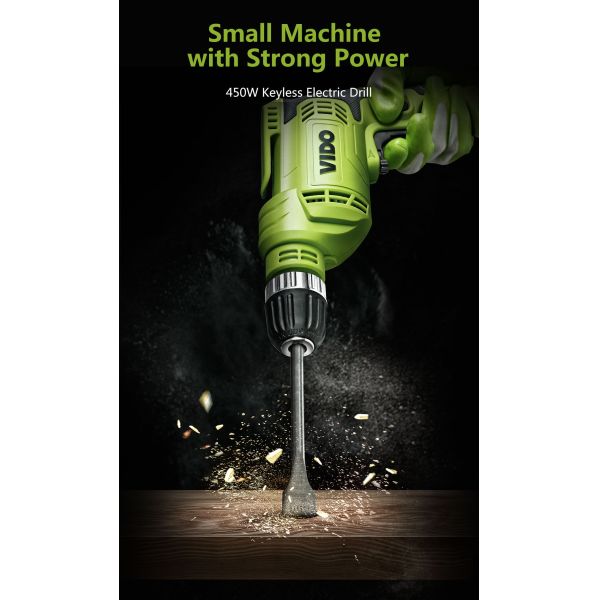 VIDO 450 watts electric power drill is utilized for steel plate, lumber, PVC material. It is an economical and practical option for all users. The quality is ensured, at the same time, each customer can afford this machine. It is one 10mm drill machine.